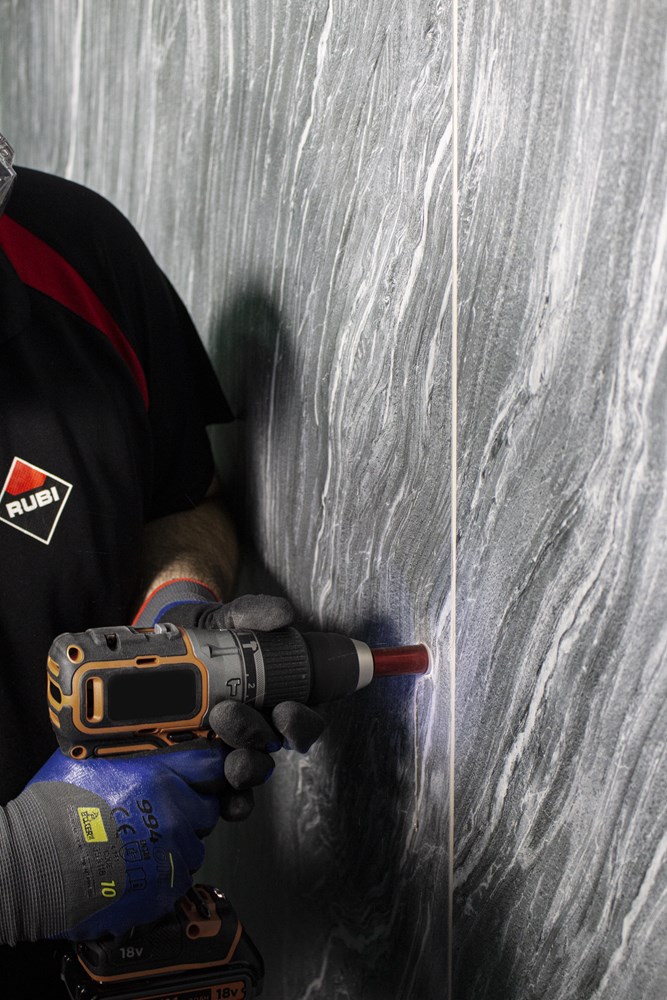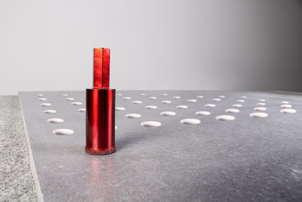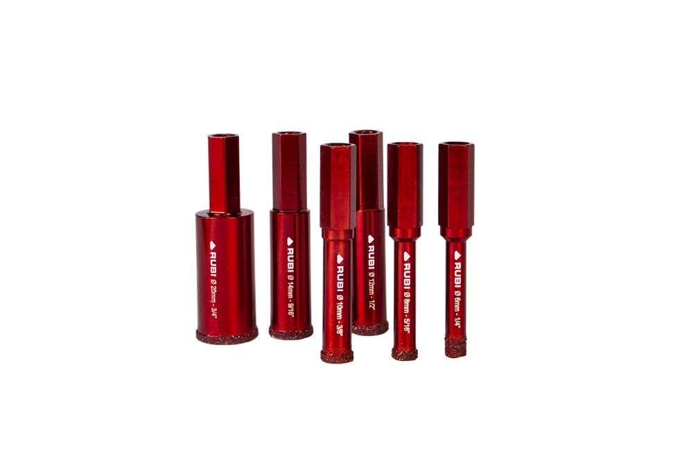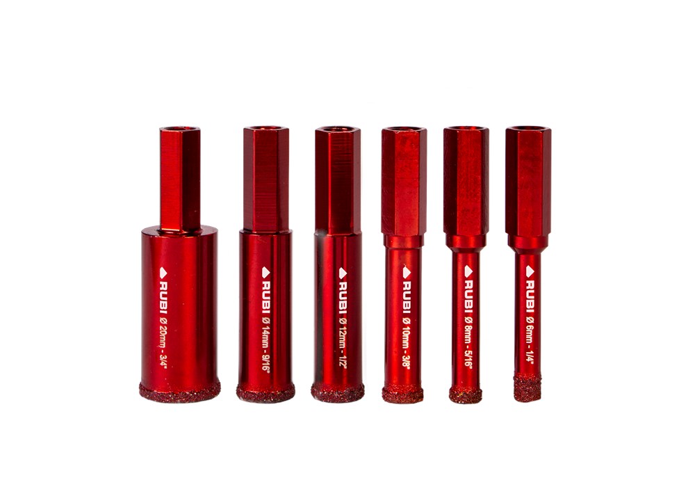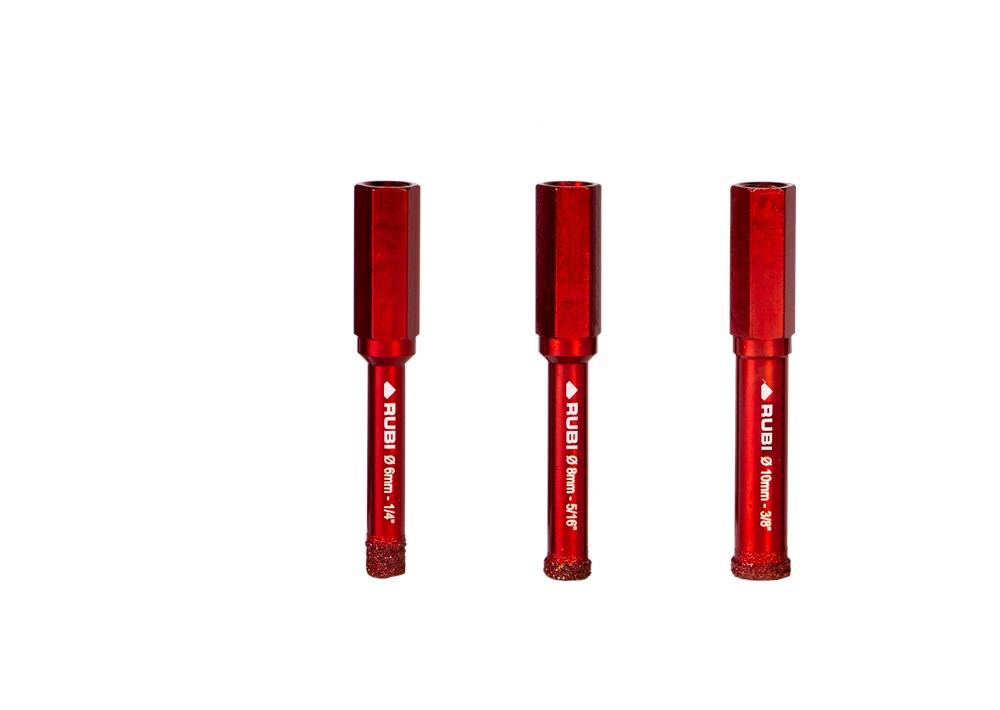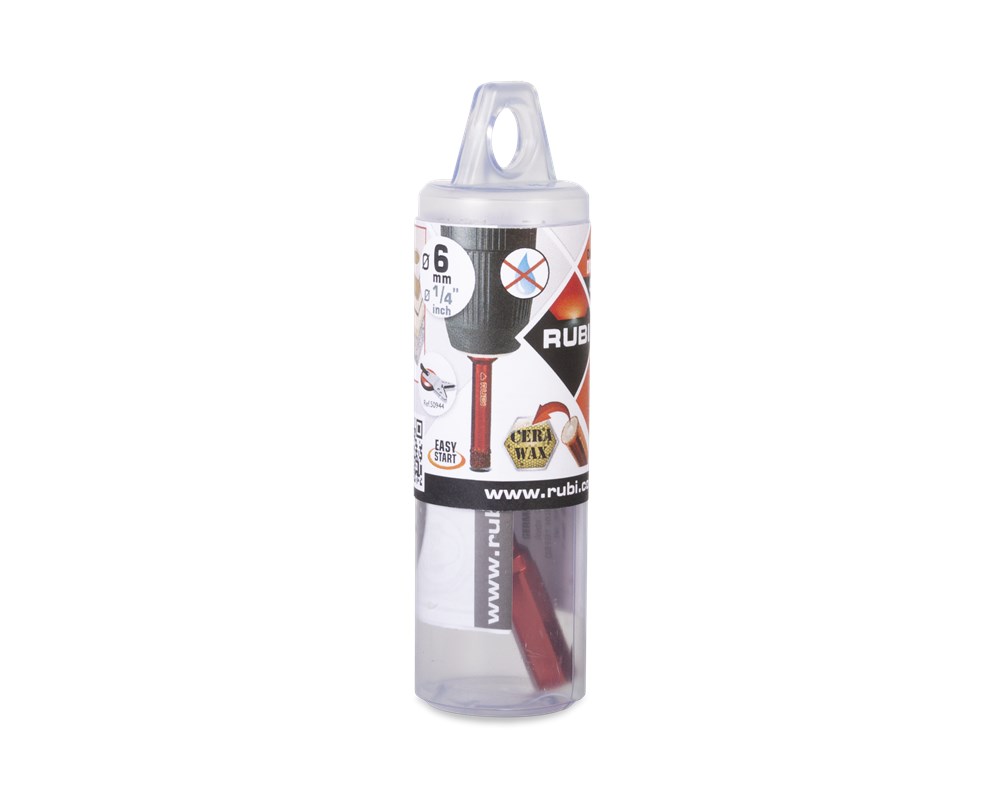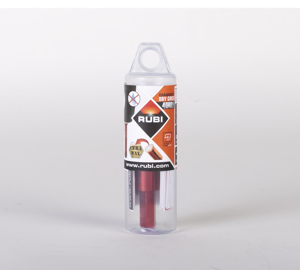 Binnen het assortiment diamantdroogboren heeft RUBI de DRYGRES 4DRILL boren. Het assortiment DRYGRES 4DRILL diamantboren wordt aanbevolen voor het boren van alle soorten keramische tegels, met name die van porseleinsteen en andere bekledingsmaterialen zoals marmer en graniet. In het assortiment van DRYGRES 4DRILL boren heeft RUBI gebruik gemaakt van de vacuümlastechniek VACUUM BRAZED, die de weerstand tegen temperatuur en wrijving verhoogt, om de diamantdeeltjes aan het booroppervlak te fixeren. DRYGRES 4DRILL boren zijn perfect voor het plaatsen van badkameraccessoires of elk type decoratief accessoire op keramische oppervlakken en/of natuursteen.DRYGRES 4DRILL diamantboren zijn ontworpen om uitsluitend te worden gebruikt met een elektrische boormachine met of zonder snoer, altijd ZONDER klopstand. Door hun zeshoekige verbinding kunnen ze zich snel aanpassen aan 13 mm boorkop.De boordiepte van DRYGRES 4DRILL boren is 36 mm voor de diameters 6, 8 en 10 mm. En 40 mm diep voor de boren met een diameter van 12, 14 en 20 mm. Alle DRYGRES 4DRILL boren bevatten wax. Deze wax smelt tijdens het gebruik van de boor en vergemakkelijkt de koeling en de afvoer van de boorresten (als de wax op is, kun je gewoon blijven boren. Alleen als al het diamant eraf is, dan kan de boor niet meer gebruikt worden). Versterkte basis met een aan te draaien schroef waardoor de wax op de tip van de boor blijft zitten.Omdat het een droogboor is, is het voor een juiste koeling van de boor noodzakelijk om tijdens het boren een lichte en constante pendelende beweging te maken en de resten van het materiaal tussentijds te verwijderen.DRYGRES 4DRILL boren, van RUBI, hebben een systeem dat het verlies van wax aan de achterkant van de boor blokkeert, waardoor de wax, altijd op de punt, geconcentreerd wordt en smering tijdens het boren verzekerd is.De aanbevolen minimumsnelheid voor DRYGRES 4DRILL diamantdroogboren is 1000 rpm. Voor een betere afwerking en een langere levensduur van de boor is het belangrijk om de juiste rotatiesnelheid te respecteren en een lichte pendelende beweging te maken tijdens het boren, en om ervoor te zorgen dat er na het boren geen resten van het geboorde materiaal in de boor achterblijven