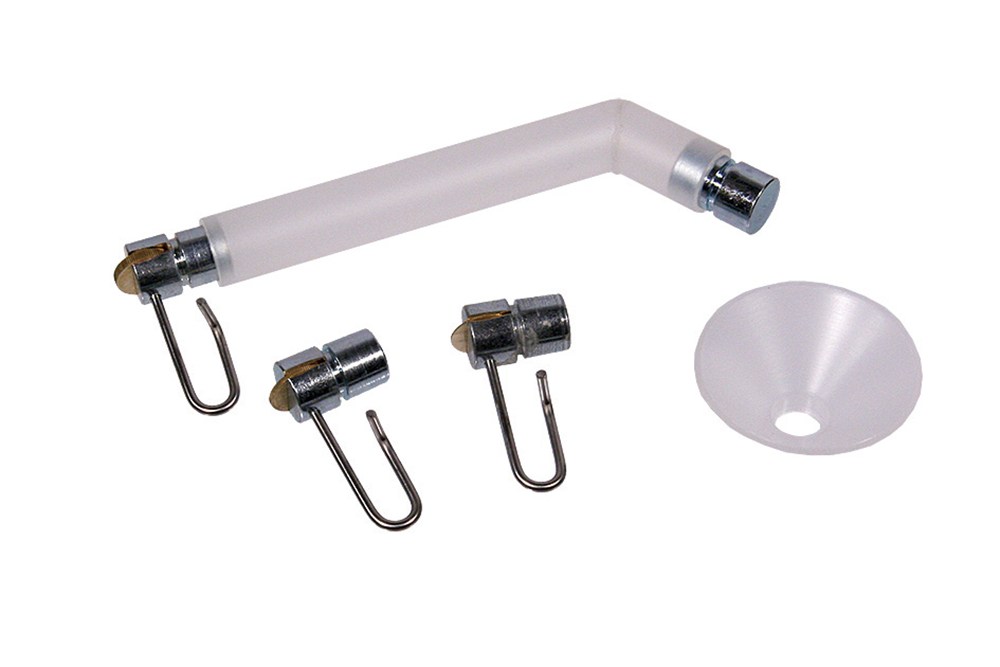 Biezentrekker-set Idee met gebogen kunststof materiaalhouder, lengte 105 mm, diameter 12 mm. Met gebogen kunststof materiaalhouder, lengte 105 mm, diameter 12 mm. Compleet met 3 bieskoppen met wieltje in de breedten 0,5 - 1,0 en 2,0 mm, metalen afsluitdop en kunststof vultrechter. Geschikt voor alle lakken en verven. Bieskoppen compleet met wieltje en losse wieltjes zijn ook in afwijkende maten leverbaar.